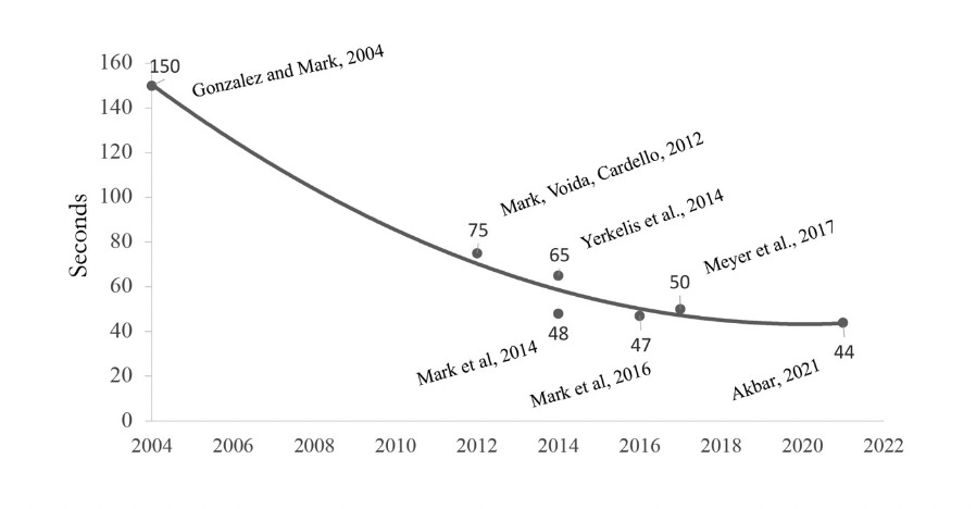 Face à tant de stimuli, la concentration devant un écran a drastiquement diminué, n'atteignant plus que 44 secondes en 2021 (source : Attention Span, Gloria Mark)